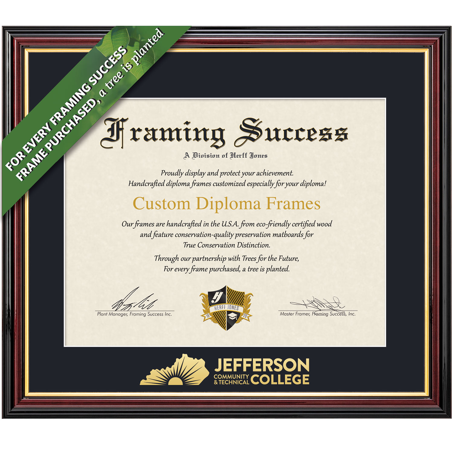 FSC certified hardwood from well-managed forests features a high-gloss cherry finish with gold inner bevel and slim contour. Our acid-free Dark Black mat features gold-leaf embossing of the College name. Made in the USA.